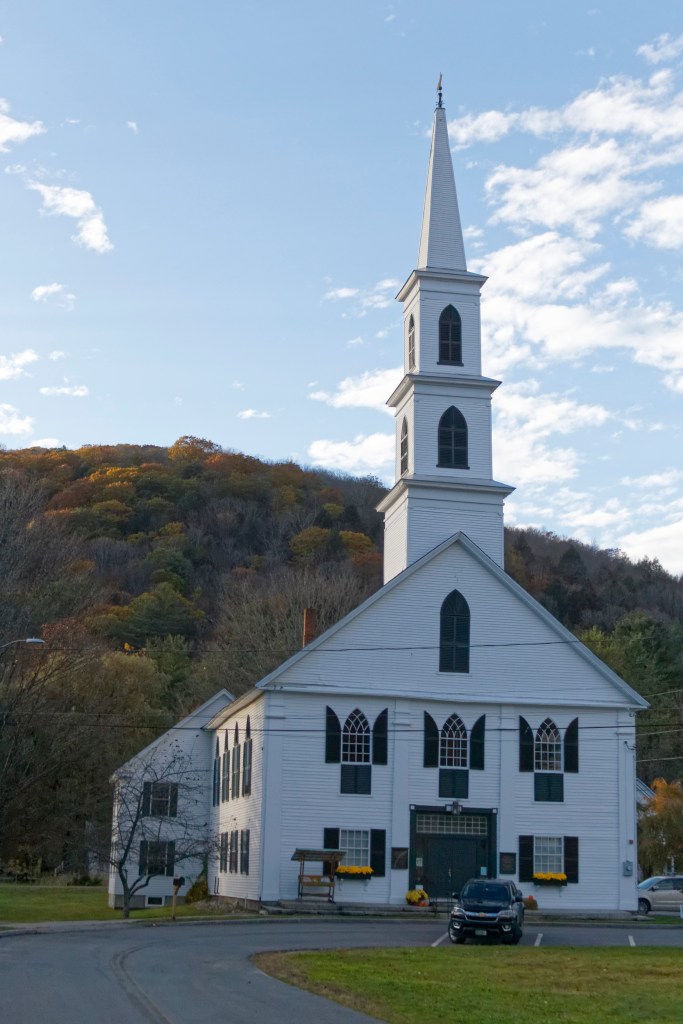 Dans cet État rural et peu peuplé, l’unique vraie ville de ce conté est Brattleboro. Les autres bourgades sont de petits villages étalés le long d’une route, avec une église peinte en blanc, voire même simplement des maisons clairsemées et dispersées dans les bois. Dans ces villages, on trouve encore des country stores dans leur jus, d’autres plus pimpants et touristiques, où l’on vend à peu près de tout : ustensiles, nourritures, vêtements, souvenirs, bois de chauffage, etc. Des ruisseaux traversent les sous-bois, tandis que les cours d’eau plus importants sont encore enjambés par des ponts couverts en bois. Le Vermont promeut également l’alimentation en circuit court, et est un important producteur de sirop d’érable et de fromages (y compris au lait cru, ce qui est ici rarissime). L’État est majoritairement démocrate, mais d’un village à l’autre, si pas au sein d’un même village, on perçoit un large spectre de sensibilités politiques et sociales, du soutien de Bernie Sanders au complotiste anti-tout et pro-Trump en passant par le pro-arme, pro-Bible et anti-masque. Cf. par exemple, cette affiche en vente dans un country store où personne ne portait de masque: « God, guns and guts made America free. Let’s keep it that way. » Tout un programme.